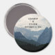 Um ímã de casamento com uma fotografia de belas montanhas, céu nublado, e colinas rolantes cheias de árvores em primeiro plano. esquema de cor azul da cinza.