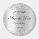 Uma Imã salve a data para o seu casamento. Um fundo com aparência de prata falsa, texto preto. Decorado com confete. Personalize e adicione seus nomes e data de casamento.