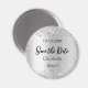Uma Imã salve a data para o seu casamento. Um fundo com aparência de prata falsa, texto preto. Decorado com confete. Personalize e adicione seus nomes e data de casamento.