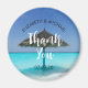 Um ímã de agradecimento de casamento com uma fotografia de uma pitoresca praia tropical nas Maldivas. Uma praia de areia branca e águas cristalinas com um guarda-sol de palha solitário. Isolado e sereno.