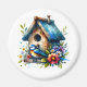 Um ímã adorável para ficar na sua frita ou armário para segurar notas importantes, menus ou trabalho de arte. Uma bela aquarela ilustra uma velha e rústica casa de pássaros brancos com um pássaro azul giro cercado por flores.