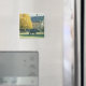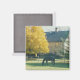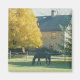 Um cavalo suavemente pastando em frente a uma casa de pedra e uma árvore amarela.
