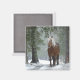 Um imã com uma fotografia de um cavalo marrom com um mane branco esfregado longo. Em pé em uma floresta com flocos de neve caindo por toda parte.