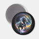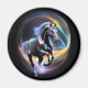 Um cavalo majestoso com um homem brilhante fica na frente, cercado por cores vibrantes e giratórias. O fundo etéreo melhora a essência encantadora e dinâmica da cena.