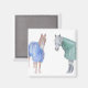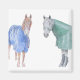 Ilustração a lápis a cores de um pônei de castanha e de um cavalo de cinza vestindo os tapetes de afluência à Nova Zelândia.