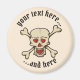 Esboço de desenho animado de caveira bege com corações. Dois campos de texto em círculo.