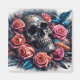 Trabalho de arte insípida com um crânio lindamente detalhado, adorado com rosas, penas e um pássaro azul vibrante, simbolizando o contraste entre vida, morte, beleza e transformação em um arranjo artístico elegante.