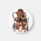 Fun and adventurous cartoon illustration of a prehistoric bearded caveman father and his young son on a thrilling mammoth hunt during the Ice Age.