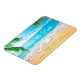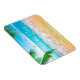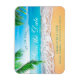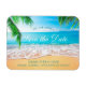 Esta Imã salve a data apresenta uma bela cena de praia com areia, ondas, galhos de palmeiras nos cantos e o horizonte. Este design tropical é perfeito para um Casamento de Verão, Casamento de Praia, Casamento da Frente Oceânica ou Casamento de Destino. As cores são brilhantes, mas tranquilas, e a cena relaxante complementa o texto elegante.