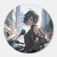 Pintura em estilo anime de uma jovem com cabelo preto curto em uma roupa preta parada perto de sua moto preta em uma rua movimentada da cidade.