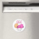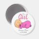 Um ímã de chá de bebê é um ótimo souvenir para os convidados da sua festa de chá de bebê. Uma menina dormindo de roupa rosa e chupando um bico rosa. Acima estão as palavras É uma menina em letras pretas e rosas, enquanto abaixo há modelos para adicionar seu nome e data.