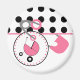 Um favor de manget de chá de fraldas com uma design de bolinhas preta no topo. Pino de fralda rosa conectado ao topo com um círculo de dentro de carruagem de bebê rosa conectado ao pino. Procure por convites na Escola Rosa.