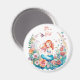 Uma sereia bonito num leito de flores, o ímã chá de fraldas da menina ilustrado com aquarela. As cores utilizadas são cor-de-rosa, coral, laranja, amarelo e azul.