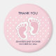 obrigado chá de fraldas seus ímãs com uma imagem adorável de pegadas de menina rosa com um contorno branco pesado. Bolinhas brancas sobre um fundo rosa atrás da ilustração.