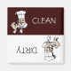 Chef Sujo Limpo com o ímã da máquina de lavar louça. A área superior mostra um desenho de um chef com seu chapéu branco de cozinhar e seu lenço branco amarrado em volta do pescoço em um fundo de amora. Vire-o, e repete a imagem em um fundo branco para sujo. Toda cozinha precisa desse ímã de chef como um lembrete para não misturar pratos sujos com os limpos. Nota: a cor é uma amora para se destacar apenas um pouco quando está numa máquina de lavar louça preta, e também vai parecer excelente para os outros.