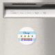 Este design de Chicago PRIDE combina os elementos da bandeira de Chicago com as cores do arco-íris LBTQ. A palavra Chicago está em uma fonte de tipo de script azul. As quatro estrelas e a palavra "PRIDE" estão nas cores do arco-íris.
