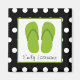 Um ímã personalizado com ilustração de um par de chinelos verdes dentro a quadrado branco com forma verde. O fundo é preto com bolinhas brancas.