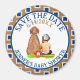 Botão personalizado marrom e azul de Salve a Data com um bebê sentado ao lado de um cachorro com tema de beisebol.