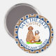Botão personalizado marrom e azul Salve a Data com um bebê sentado ao lado de um cachorro com tema de beisebol.