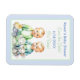 Chuva de bebê azul e verde - Salve a Data para gêmeos meninos. Lindo cartão de gêmeos meninos ao estilo aquarela segurando brinquedos como um cordeiro, coelho e um doce pintinho - ímã para salvar a data.