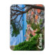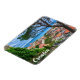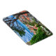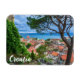 Vista da pequena cidade de Omis rodeada de montanhas, rio Cetina e mar, Makarska Riviera, Croácia. Vista do pinheiro, centro da cidade com telhados vermelhos e azul.