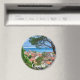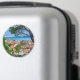 Vista da pequena cidade de Omis rodeada de montanhas, rio Cetina e mar, Makarska Riviera, Croácia. Vista do pinheiro, centro da cidade com telhados vermelhos e azul.