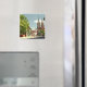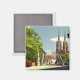 Fotografia da Cidade Velha em Wroclaw, Polônia. Duas torres em ascensão da Catedral, uma ponte romântica sobre o rio, árvores verdes e muito sol.