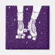 Uma ilustração de uma mulher ou de um rolo feminino patinando à noite. Seus pés e skates estão no céu noturno roxo, estrelado, acima de uma floresta.