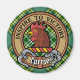 Crachá da crista de galo Clan Currie rodeado por uma correia e fivela sobre fundo tartano. Custom Text.