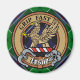 Crachá da crista Clan Leslie cercado por uma correia e fivela sobre a caça ao fundo do tartan. Custom Text.