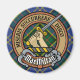 Crachá da crista Clan MacMillan cercado por uma correia e fivela sobre a caça ao fundo do tartan. Custom Text.