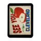 Um charmoso imã de geladeira de viagens vintage Cleveland Ohio com uma linda maçã vermelha, junto com um texto divertido no estilo retrorreflector que diz, "Veja você em Cleveland"