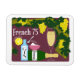 Uma elegante imagem de Art Deco de vinhas e uvas envolve os ingredientes de um francês 75. Champanhe, açúcar, gin e limão... tão simples, mas tão ooh la la!