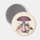 Vintage bonito parece imã de geladeira com cogumelos cor-de-rosa com florais cor-de-rosa e folhas verdes e peludas sobre fundo listrado vintage