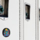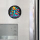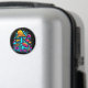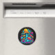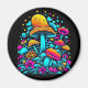 Arte neon colorida com cogumelos e flores azuis e cor-de-rosa e um fundo preto.