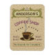 Esta imã de geladeira retangular com o tema do café é para qualquer pessoa que administre seu próprio compro de café ou tenha um tema de café na decoração da cozinha da sua casa. Feito em cor marrom, verde, púrpura e pincéis de laranja, este design de inspiração espresso/cappuccino apresenta uma xícara em um disco, duas banners de texto personalizados e as palavras "Compro de café / Raiva fresca / Sabor de Excelente" em roxo. A caneca está a vapor e a faixa de cima tem espirais que imitam a fumaça. Tudo repousa sobre um fundo claro de feijão-de-café. Use as modelos para adicionar seu nome facilmente. Você também pode mudar o slogan inferior se quiser, que atualmente lê, "Sem Motivos para Reclamação." Se precisar redimensionar o texto para o ajustado, clique em "Personalizar." Pegue uma xícara de Joe e admire seu próprio e personalizado ímã flexível para café.