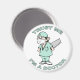 O Doutor está dentro. Quem é o próximo? Um cartoon de um cirurgião vestido com esfregões verdes e uma máscara de rosto branco segurando uma mão gigante serrada atrás de suas costas. Abaixo dele está a frase "Confie em mim, sou um Doutor"