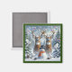 Dois grandes veados, chifres a churrasco, ignoram um boneco de neve aninhado em pínus. O boneco de neve, com um chapéu preto e um cachecol laranja, está rodeado por pombas brancas de tartaruga. Uma floresta de pinheiros com coníferas de neve fornece o pano de fundo, enquanto bolhas coloridas e transparentes flutuam na cinza, céu nevado.