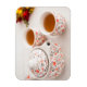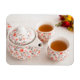 Chá cerâmico com padrão floral, e flores freesias fora de foco no fundo.