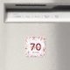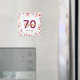 Um ímã para uma festa de aniversário de 70 anos feminina, como lembrança ou lembrete de data para os seus convidados. Ramos com flores de magnólia rosa, roxo e dourado. Fundo branco elegante. Modelos para nome, idade 70 e data. Data de nascimento ou data da festa/aniversário. Letras douradas e cor de vinho. O nome é escrito com um estilo de letra manuscrita moderna.