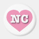 Este ímã apresenta um coração cor-de-rosa vibrante contendo as letras maiúsculas, brancas e em negrito NC, a abreviação oficial da Carolina do Norte, o estado do calcanhar de alcatrão.