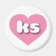 Este ímã apresenta um coração cor-de-rosa vibrante contendo as letras maiúsculas, brancas, redondas e em negrito, uma abreviação lúdica para Kansas, o estado do girassol.