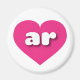 Este ímã apresenta um coração cor-de-rosa-quente vibrante contendo as letras maiúsculas em negrito, arredondadas, brancas e brancas, ar, uma versão lúdica da abreviação para Arkansas, o estado natural.