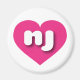 Este ímã apresenta um coração cor-de-rosa-quente vibrante contendo as letras maiúsculas nj, em letras maiúsculas brancas e em negrito, uma versão lúcida da abreviação para o estado de Nova Jersey, o estado do jardim.