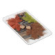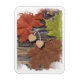Folhas de juta coloridas em queda rodeiam dois pequenos corações de madeira dispostos em conselhos de vedação de penas. Adorável adição à cozinha para quem ama o outono. A foto original é mascarada para adicionar profundidade com fundo branco.