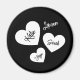 Esta design engraçada começa com um fundo preto rico e apresenta 3 corações coordenadores num aglomerado, segurando os nomes de seus entes queridos... em caracteres negros. Seu nome fica bem acima. Adicione seus nomes seguindo o prompt "Personalizar este modelo". Faz um presente maravilhoso para a mãe! Este design de botão também parece esmagar no avental de coordenação e na luva do forno!