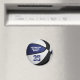 Este ímã legal do tema basquetebol apresenta a imagem realista de uma bola de basquete que tem painéis coloridos azuis, brancos e pretos alternados - facilmente personalizados com o nome da equipe e o nome do atleta & número de camisa - por katz_d_zynes