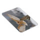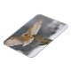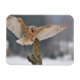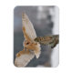 Coruja-de-barão aterrando no inverno com neve em segundo plano
