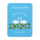Este incrível ímã de Save the Date Wedding apresenta uma imagem de arte digital de um par de belos cisnes brancos com bicos laranja virados um para o outro, parecendo que estão se beijando. Abaixo dos cisnes há um grupo de lindas flores de nenúfar rosa com centros amarelos e folhas verdes. Um belo design de casamento. Há texto personalizado para que você possa incluir os nomes do casal feliz e a data do casamento.