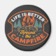 Estilo de crachá retrorreflector acampamento gráfico com a fogueira "A vida é melhor em volta da Campfire" sobre fundo aqua escuro